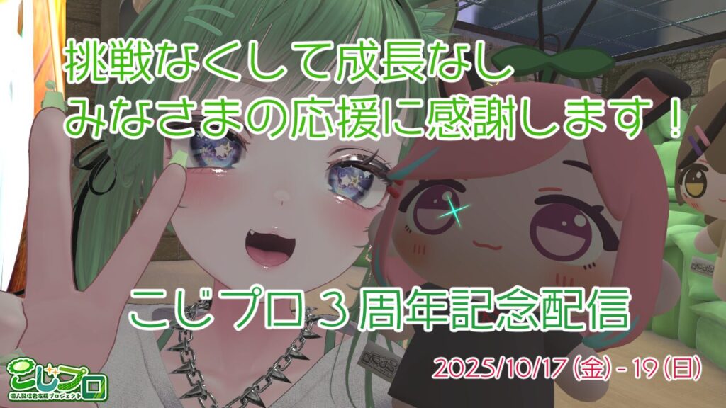 - 10月17日(金)と19日(日)は🌱こじプロ3周年記念!今年も2日間だぁ!10月19日(日)は、こじプロ設立記念日なのです!3 周年でございます♪1年目、2年目と比べたら、大分楽になった 3 年目でした(*´∀`*)3 期生を迎えることもできました。今年もメンバーと 1 対 1 でお話していこうと思います。みんなにとって、この 1 年はどんな年だったのかな?