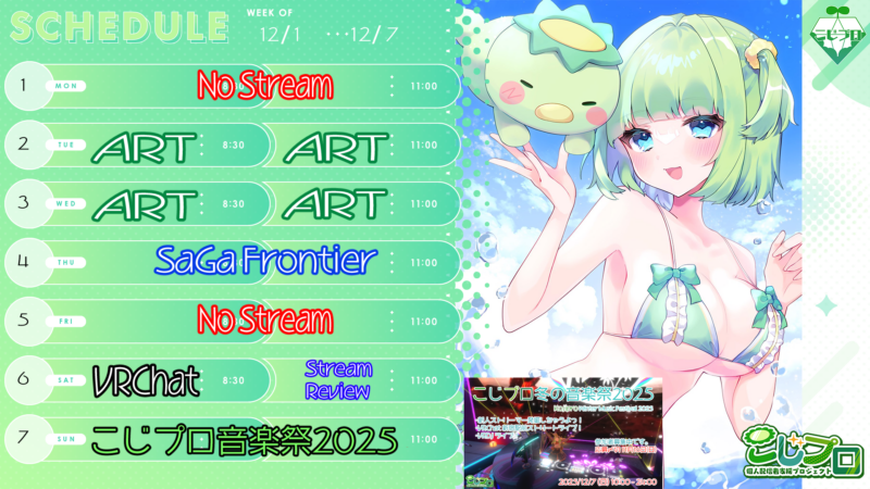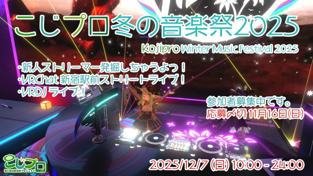 - 🌱こじプロ冬の音楽祭2025やほぉ~ぱきちだよっ!この冬、オンラインで開催する音楽フェス「🌱こじプロ冬の音楽祭2025」を企画しました。たくさんの人が参加してくれたので、1 日VRChat ストリートライブ、夜は VRDJ ライブ — 1 日を通して“つながり”と“発見”の場にしたいと思ってるよ(๑•̀ㅂ•́)و✧
