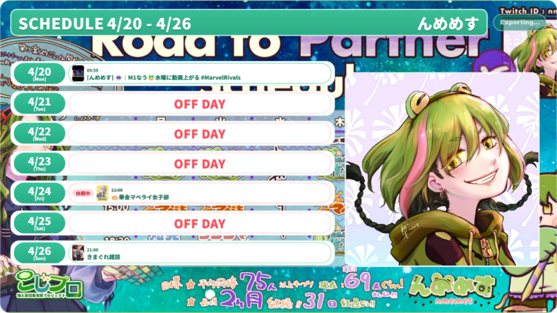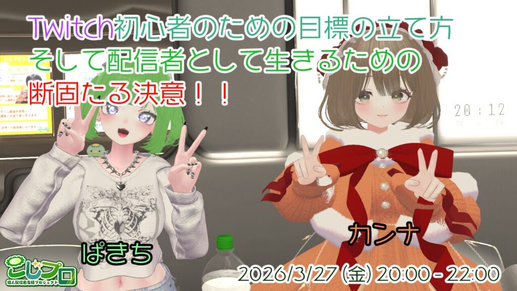- 【Twitch初心者】始めての目標の立て方。配信者として生きるための断固たる決意!!VRChat内で、配信大先輩のカンナさんとぱきちが「配信活動」をテーマに語り合う座談会だよぉ。珍しく真面目な企画!