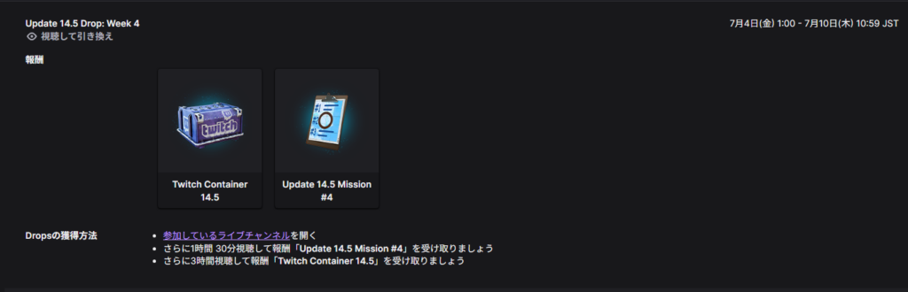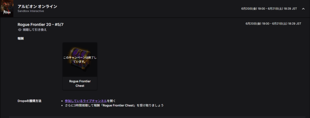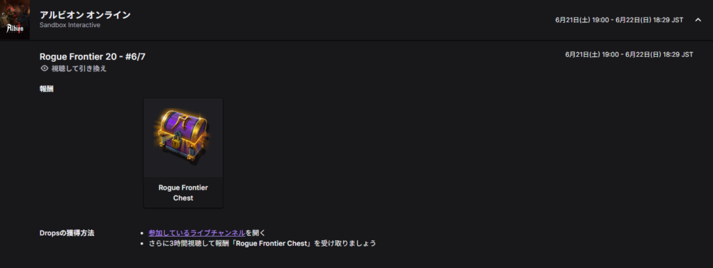 配信している時は、自分のチャンネルをブラウザで見ながら、Drops 貰ってました。
