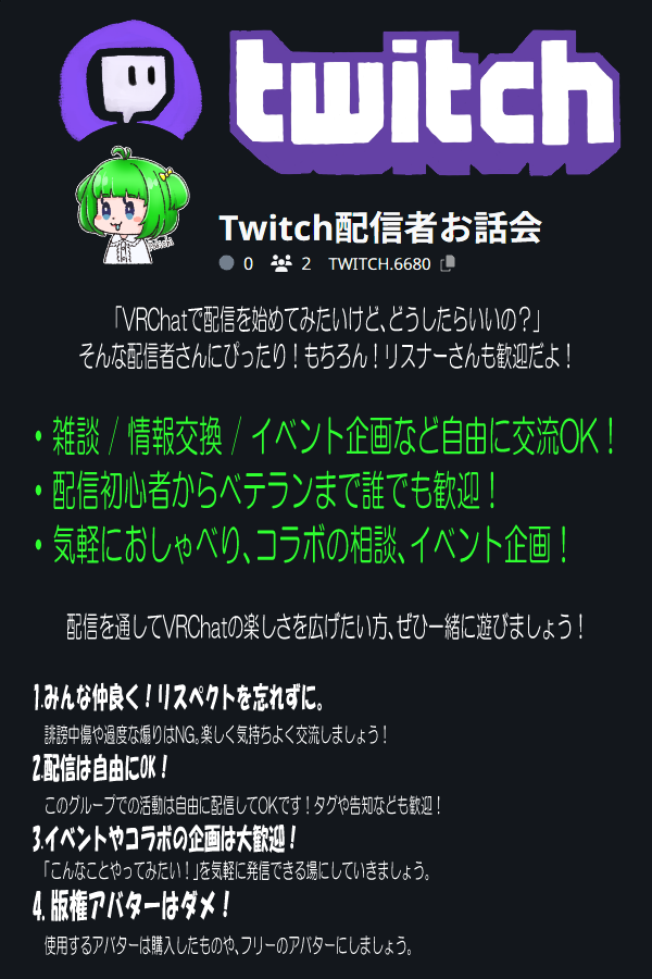 Twitch 配信者向けのグループですが、誰でも入れるので少しでも気になる方は、ぜひ参加してみてください。